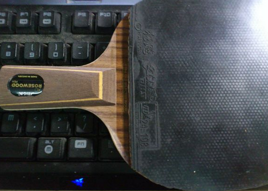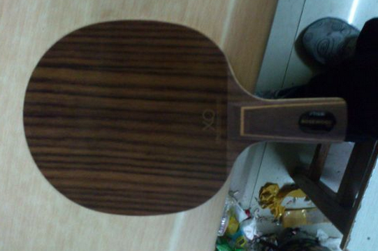 ? 直板玫瑰XO帶膜78.5克,原先器材為新版加厚YEO?85克,正手省狂39度(灌膨脹油,不刷膠水,無機粘貼)反手為安度銳煞2.1厚度。新板子直接粘上了原先的膠皮,由于本人沒怎么燒底板,所以也就只能跟YEO作一個比較多的對比!下面上幾個圖此次試打的玫瑰XO。